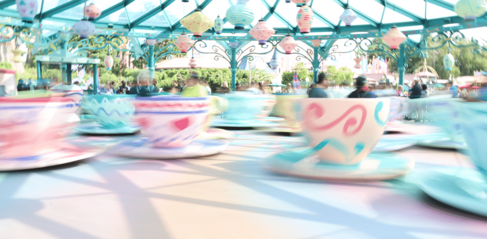 Subidos a tazas de té de gran tamaño, los visitantes se embarcan en un torbellino de risas y sonrisas. Las tazas giran sobre sí mismas mientras se desplazan por el centro de la atracción, creando una sensación de vértigo. Cada taza de té está equipada con una rueda que los visitantes pueden girar para controlar la velocidad a la que gira su taza, lo que permite a cada uno adaptar su experiencia a su nivel de comodidad.